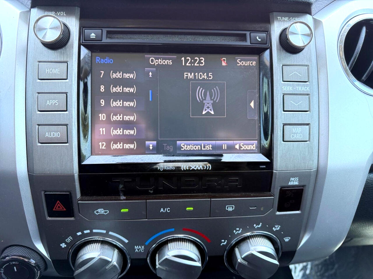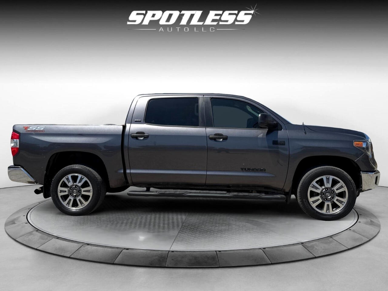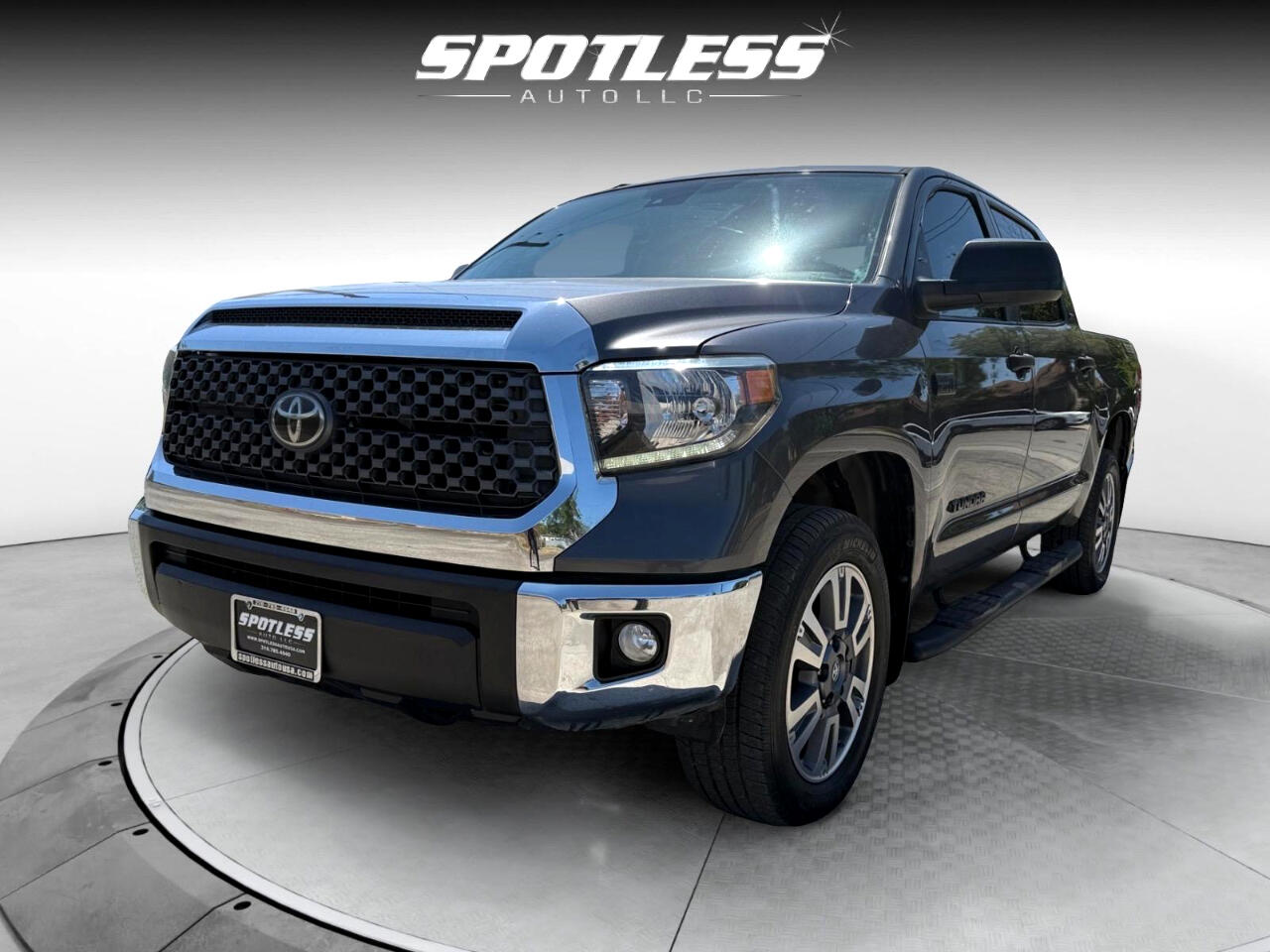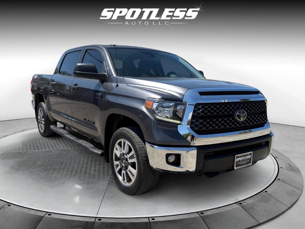 Gray 2019 Toyota Tundra SR5 CrewMax 4WD 6-Speed Automatic Electronic i-Force 5.7L V8 Flex Fuel DOHC 32V LEV 4WD, Cloth. Awards: * JD Power Vehicle Dependability Study (VDS) * ALG Residual Value Awards, Residual Value Awards * 2019 KBB.com Brand Image Awards * 2019 KBB.com Best Resale Value Awards 4WD, Cloth, 18" x 8J Styled Steel Wheels, 3-Passenger Front Bench Seat, 38 Gallon Fuel Tank Capacity, 4-Wheel Disc Brakes, 4.30 Axle Ratio, 6 Speakers, ABS brakes, Air Conditioning, AM/FM radio: SiriusXM, Anti-Theft Immobilizer w/Alarm, Auto High-beam Headlights, Auto-Dimming Rear-View Mirror, Auto-dimming Rear-View mirror, Brake assist, CD player, Compass, Deck Rail System, Delay-off headlights, Driver door bin, Driver vanity mirror, Dual front impact airbags, Dual front side impact airbags, Electronic Stability Control, Exterior Parking Camera Rear, Fabric Seat Trim, Front anti-roll bar, Front Bucket Seats, Front Center Armrest w/Storage, Front fog lights, Front reading lights, Front wheel independent suspension, Fully automatic headlights, Garage door transmitter: HomeLink, Heated door mirrors, HomeLink Universal Transceiver, Illuminated entry, Knee airbag, Leather Shift Knob, Low tire pressure warning, Occupant sensing airbag, Outside temperature display, Overhead airbag, Overhead console, Panic alarm, Passenger door bin, Passenger vanity mirror, Power door mirrors, Power steering, Power windows, Radio: Entune Audio Plus AM/FM/HD Radio w/CD, Radio: Entune Premium Audio AM/FM w/HD Radio & CD, Rear reading lights, Rear seat center armrest, Rear step bumper, Rear window defroster, Remote keyless entry, Speed control, Speed-sensing steering, Split folding rear seat, Tachometer, Tilt steering wheel, Traction control, TRD Shift Knob, Trip computer, Variably intermittent wipers, and Voltmeter.