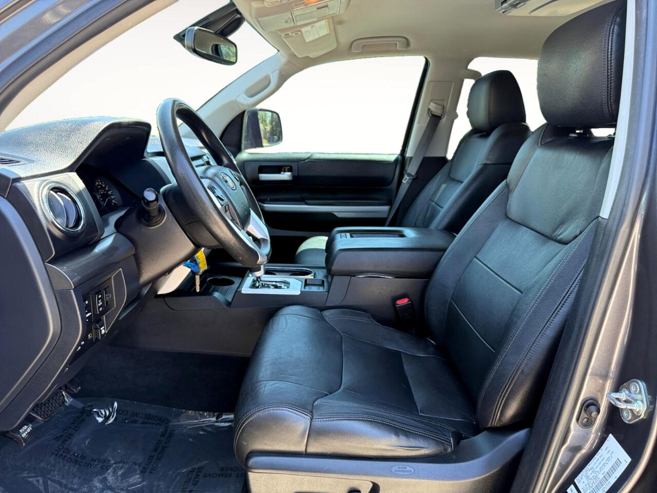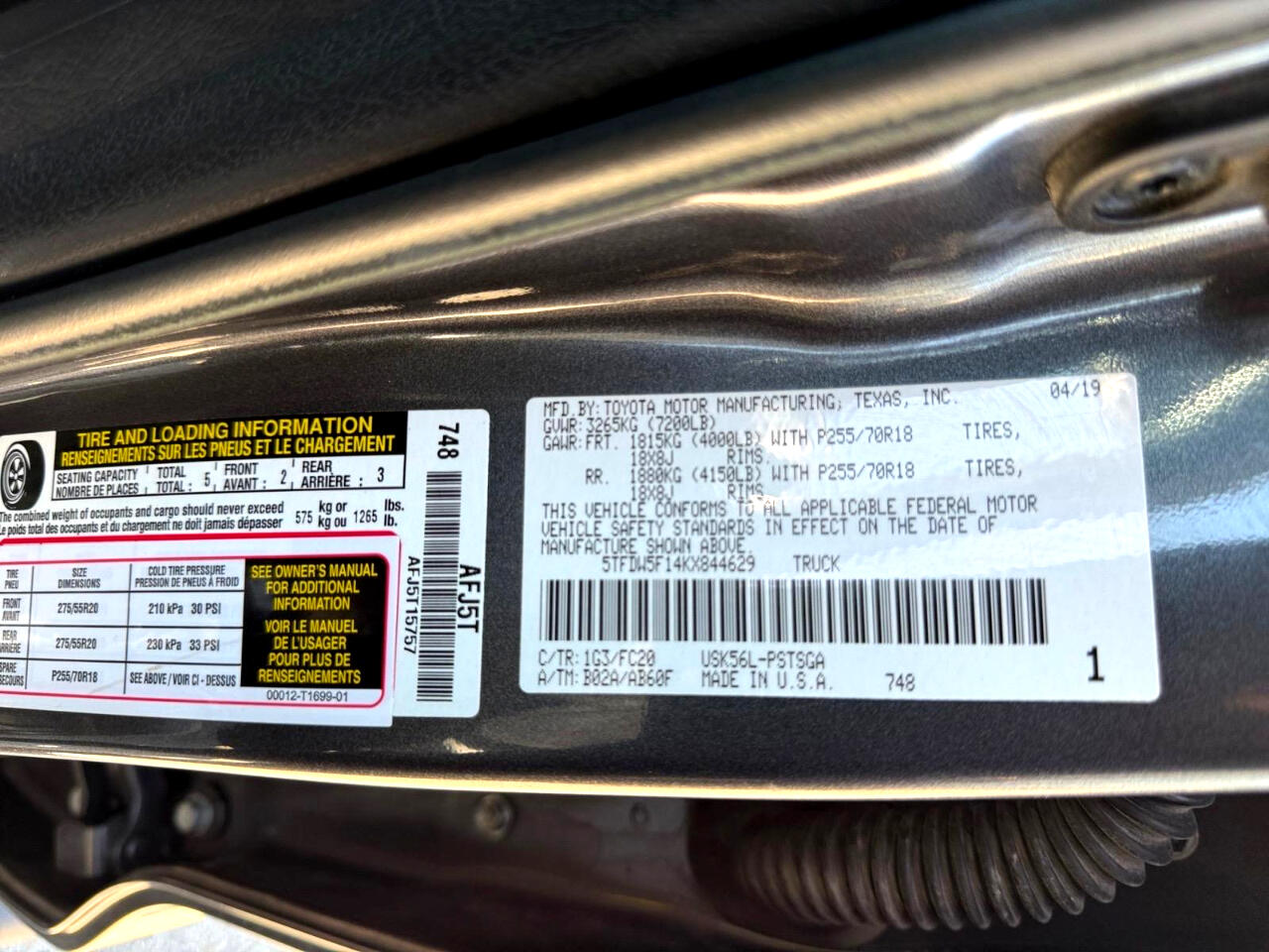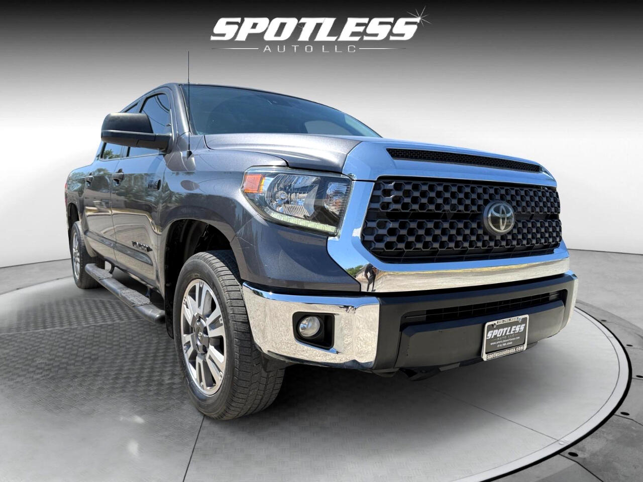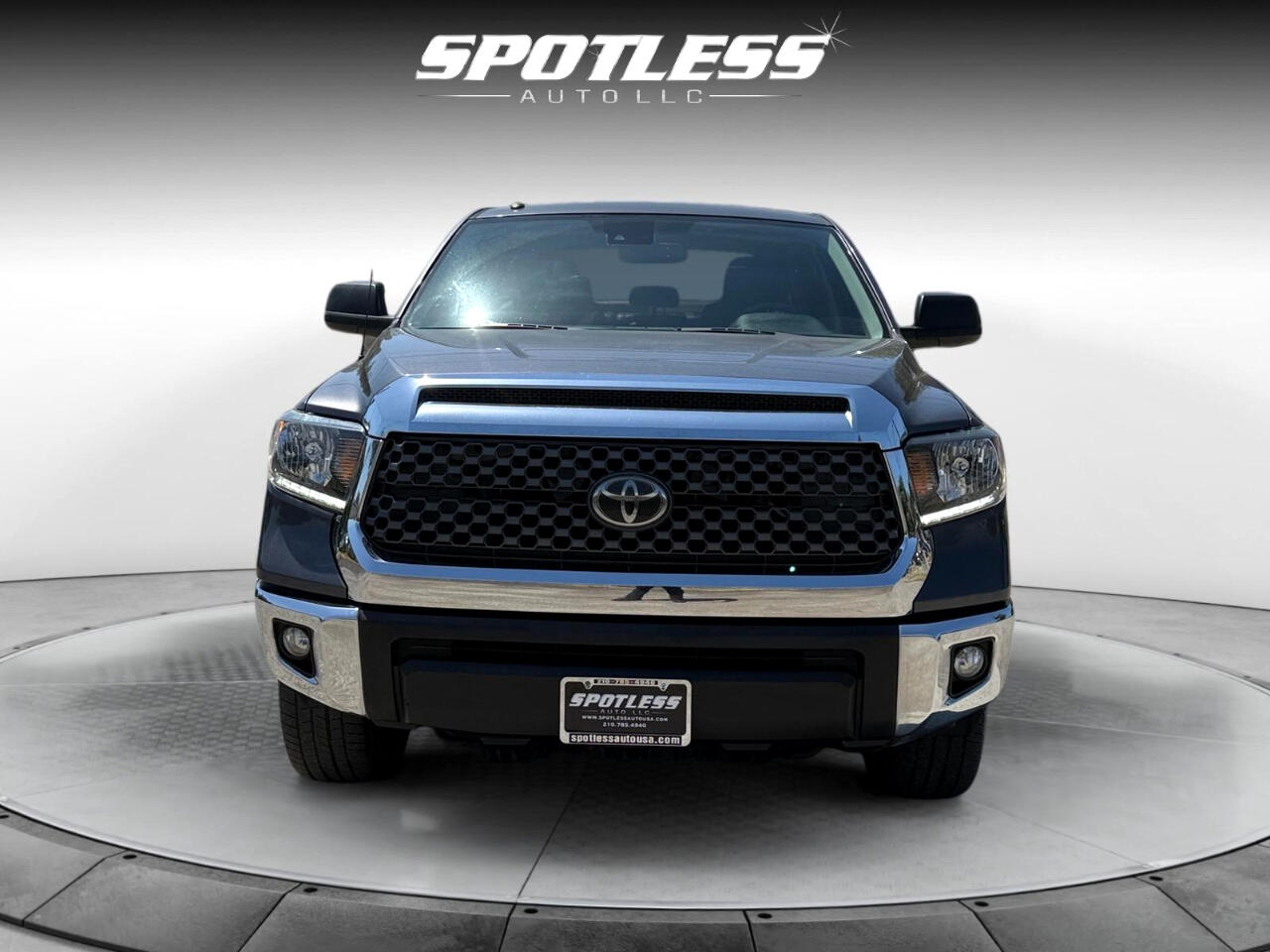 Gray 2019 Toyota Tundra SR5 CrewMax 4WD 6-Speed Automatic Electronic i-Force 5.7L V8 Flex Fuel DOHC 32V LEV 4WD, Cloth. Awards: * JD Power Vehicle Dependability Study (VDS) * ALG Residual Value Awards, Residual Value Awards * 2019 KBB.com Brand Image Awards * 2019 KBB.com Best Resale Value Awards 4WD, Cloth, 18" x 8J Styled Steel Wheels, 3-Passenger Front Bench Seat, 38 Gallon Fuel Tank Capacity, 4-Wheel Disc Brakes, 4.30 Axle Ratio, 6 Speakers, ABS brakes, Air Conditioning, AM/FM radio: SiriusXM, Anti-Theft Immobilizer w/Alarm, Auto High-beam Headlights, Auto-Dimming Rear-View Mirror, Auto-dimming Rear-View mirror, Brake assist, CD player, Compass, Deck Rail System, Delay-off headlights, Driver door bin, Driver vanity mirror, Dual front impact airbags, Dual front side impact airbags, Electronic Stability Control, Exterior Parking Camera Rear, Fabric Seat Trim, Front anti-roll bar, Front Bucket Seats, Front Center Armrest w/Storage, Front fog lights, Front reading lights, Front wheel independent suspension, Fully automatic headlights, Garage door transmitter: HomeLink, Heated door mirrors, HomeLink Universal Transceiver, Illuminated entry, Knee airbag, Leather Shift Knob, Low tire pressure warning, Occupant sensing airbag, Outside temperature display, Overhead airbag, Overhead console, Panic alarm, Passenger door bin, Passenger vanity mirror, Power door mirrors, Power steering, Power windows, Radio: Entune Audio Plus AM/FM/HD Radio w/CD, Radio: Entune Premium Audio AM/FM w/HD Radio & CD, Rear reading lights, Rear seat center armrest, Rear step bumper, Rear window defroster, Remote keyless entry, Speed control, Speed-sensing steering, Split folding rear seat, Tachometer, Tilt steering wheel, Traction control, TRD Shift Knob, Trip computer, Variably intermittent wipers, and Voltmeter.