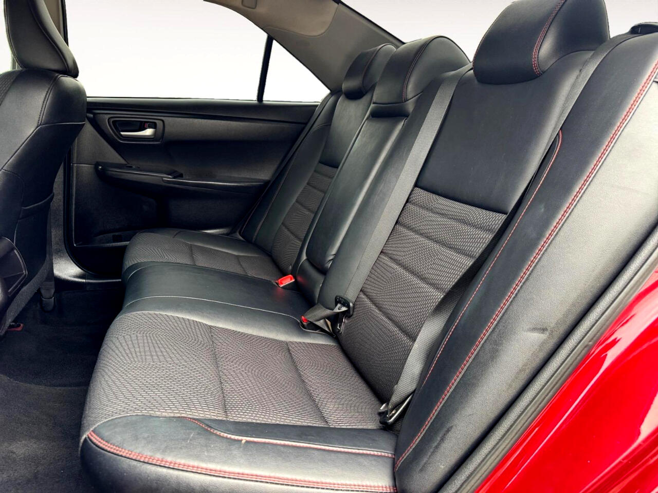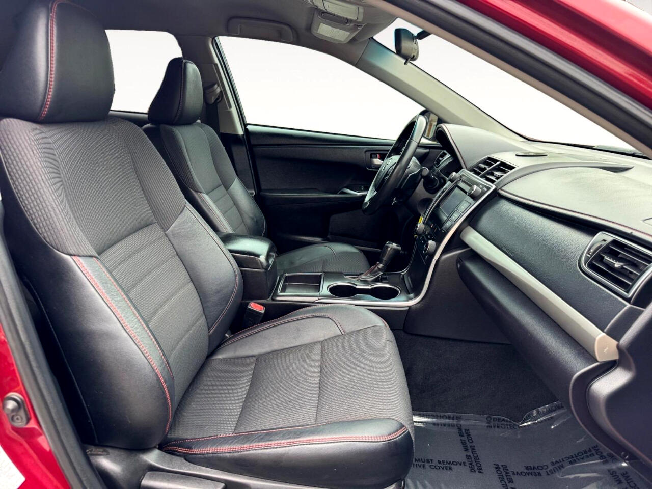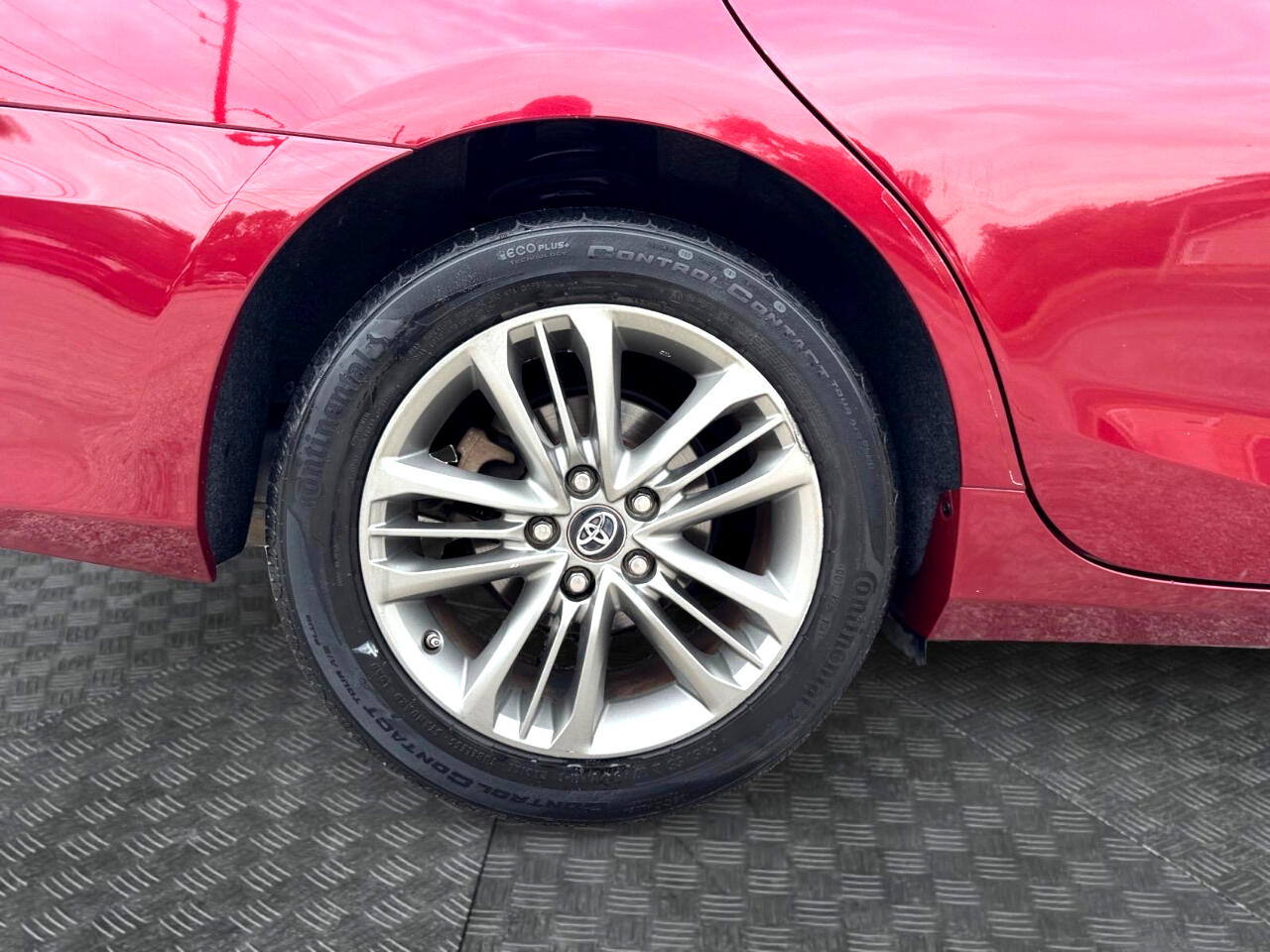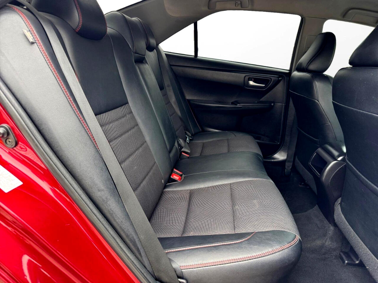 24/33 City/Highway MPG Red 2017 Toyota Camry XSE FWD 6-Speed Automatic 2.5L I4 SMPI DOHC Leather. Awards: * 2017 KBB.com 10 Most Comfortable Cars Under $30,000 * 2017 KBB.com 10 Best Sedans Under $25,000 * 2017 KBB.com 10 Best Used Cars Under $20,000 * 2017 KBB.com 10 Most Awarded Brands * 2017 KBB.com Best Resale Value Awards Leather, 10 Speakers, 4-Wheel Disc Brakes, 7.5J x 18" Alloy Wheels, ABS brakes, Air Conditioning, Alloy wheels, AM/FM radio: SiriusXM, Automatic temperature control, Brake assist, Bumpers: body-color, CD player, Delay-off headlights, Driver door bin, Driver vanity mirror, Dual front impact airbags, Dual front side impact airbags, Electronic Stability Control, Exterior Parking Camera Rear, Four wheel independent suspension, Front anti-roll bar, Front Bucket Seats, Front Center Armrest, Front dual zone A/C, Front reading lights, Fully automatic headlights, Heated door mirrors, Heated front seats, Illuminated entry, Knee airbag, Leather steering wheel, Low tire pressure warning, Multi-Stage Heated Front Bucket Seats, Occupant sensing airbag, Outside temperature display, Overhead airbag, Overhead console, Panic alarm, Passenger door bin, Passenger vanity mirror, Power door mirrors, Power driver seat, Power passenger seat, Power steering, Power windows, Radio: Entune Audio Plus w/Connected Nav/JBL Audio, Rear anti-roll bar, Rear seat center armrest, Rear side impact airbag, Rear window defroster, Remote keyless entry, Speed control, Speed-sensing steering, Split folding rear seat, Spoiler, Sport Leather-Trimmed Ultrasuede Seat Trim, Sport steering wheel, Steering wheel mounted audio controls, Tachometer, Telescoping steering wheel, Tilt steering wheel, Traction control, Trip computer, and Variably intermittent wipers.
