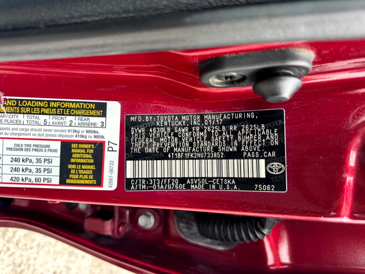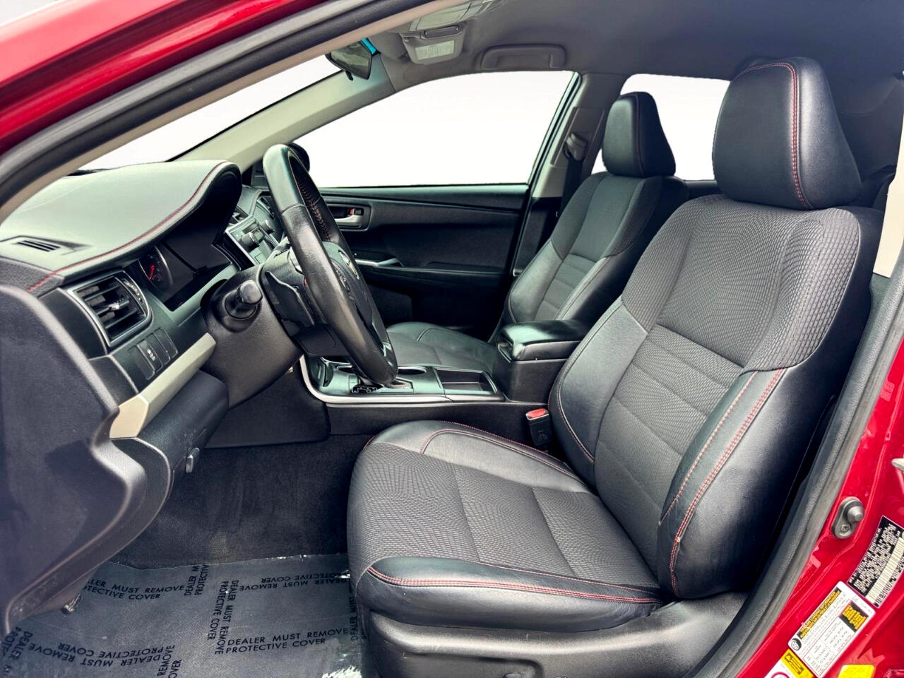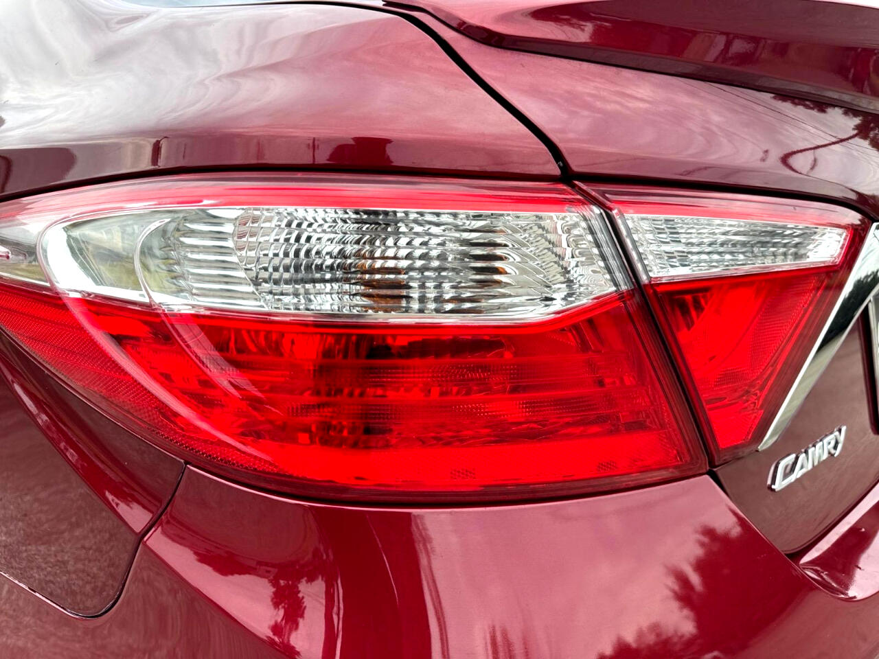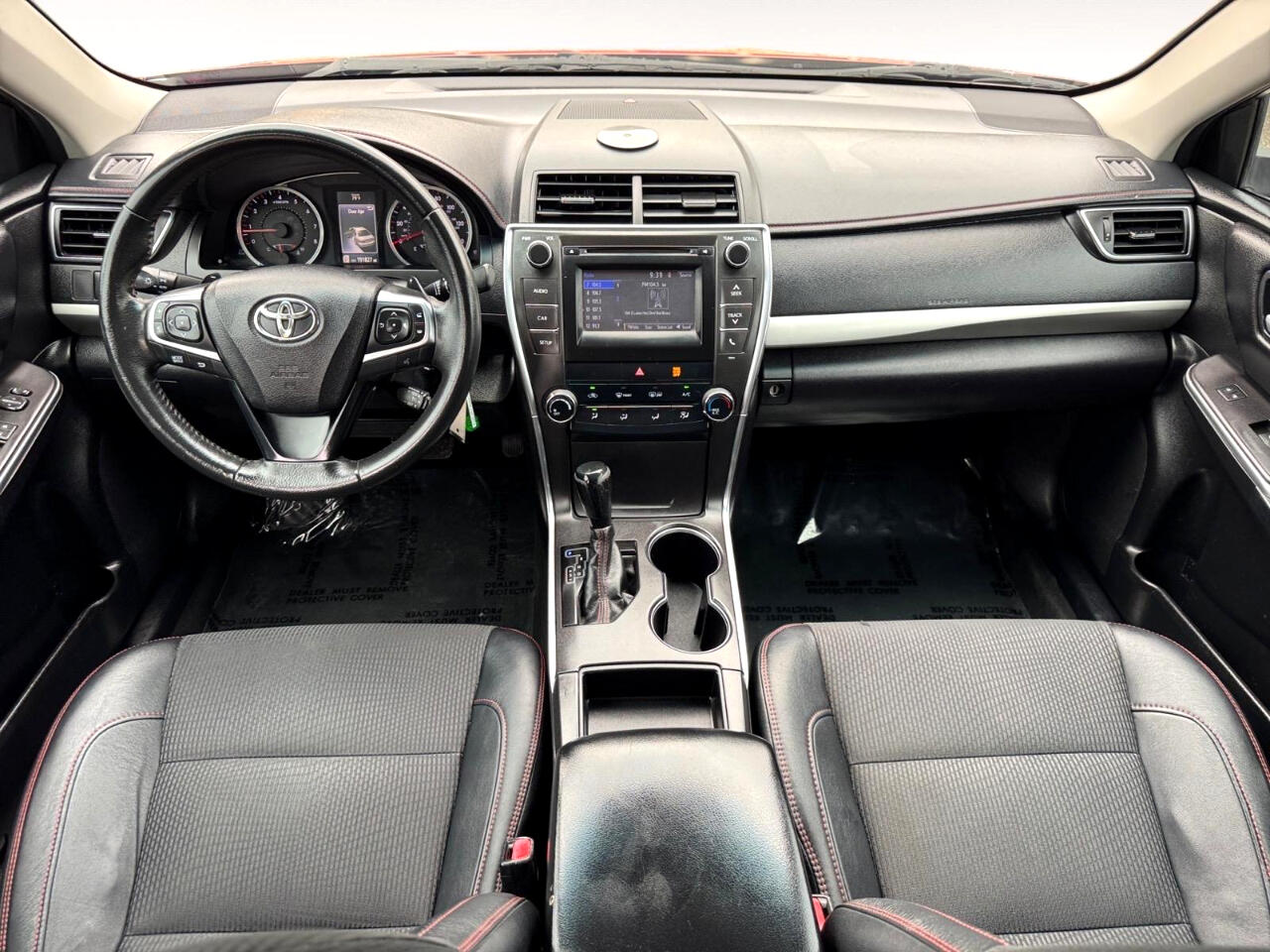 24/33 City/Highway MPG Red 2017 Toyota Camry XSE FWD 6-Speed Automatic 2.5L I4 SMPI DOHC Leather. Awards: * 2017 KBB.com 10 Most Comfortable Cars Under $30,000 * 2017 KBB.com 10 Best Sedans Under $25,000 * 2017 KBB.com 10 Best Used Cars Under $20,000 * 2017 KBB.com 10 Most Awarded Brands * 2017 KBB.com Best Resale Value Awards Leather, 10 Speakers, 4-Wheel Disc Brakes, 7.5J x 18" Alloy Wheels, ABS brakes, Air Conditioning, Alloy wheels, AM/FM radio: SiriusXM, Automatic temperature control, Brake assist, Bumpers: body-color, CD player, Delay-off headlights, Driver door bin, Driver vanity mirror, Dual front impact airbags, Dual front side impact airbags, Electronic Stability Control, Exterior Parking Camera Rear, Four wheel independent suspension, Front anti-roll bar, Front Bucket Seats, Front Center Armrest, Front dual zone A/C, Front reading lights, Fully automatic headlights, Heated door mirrors, Heated front seats, Illuminated entry, Knee airbag, Leather steering wheel, Low tire pressure warning, Multi-Stage Heated Front Bucket Seats, Occupant sensing airbag, Outside temperature display, Overhead airbag, Overhead console, Panic alarm, Passenger door bin, Passenger vanity mirror, Power door mirrors, Power driver seat, Power passenger seat, Power steering, Power windows, Radio: Entune Audio Plus w/Connected Nav/JBL Audio, Rear anti-roll bar, Rear seat center armrest, Rear side impact airbag, Rear window defroster, Remote keyless entry, Speed control, Speed-sensing steering, Split folding rear seat, Spoiler, Sport Leather-Trimmed Ultrasuede Seat Trim, Sport steering wheel, Steering wheel mounted audio controls, Tachometer, Telescoping steering wheel, Tilt steering wheel, Traction control, Trip computer, and Variably intermittent wipers.