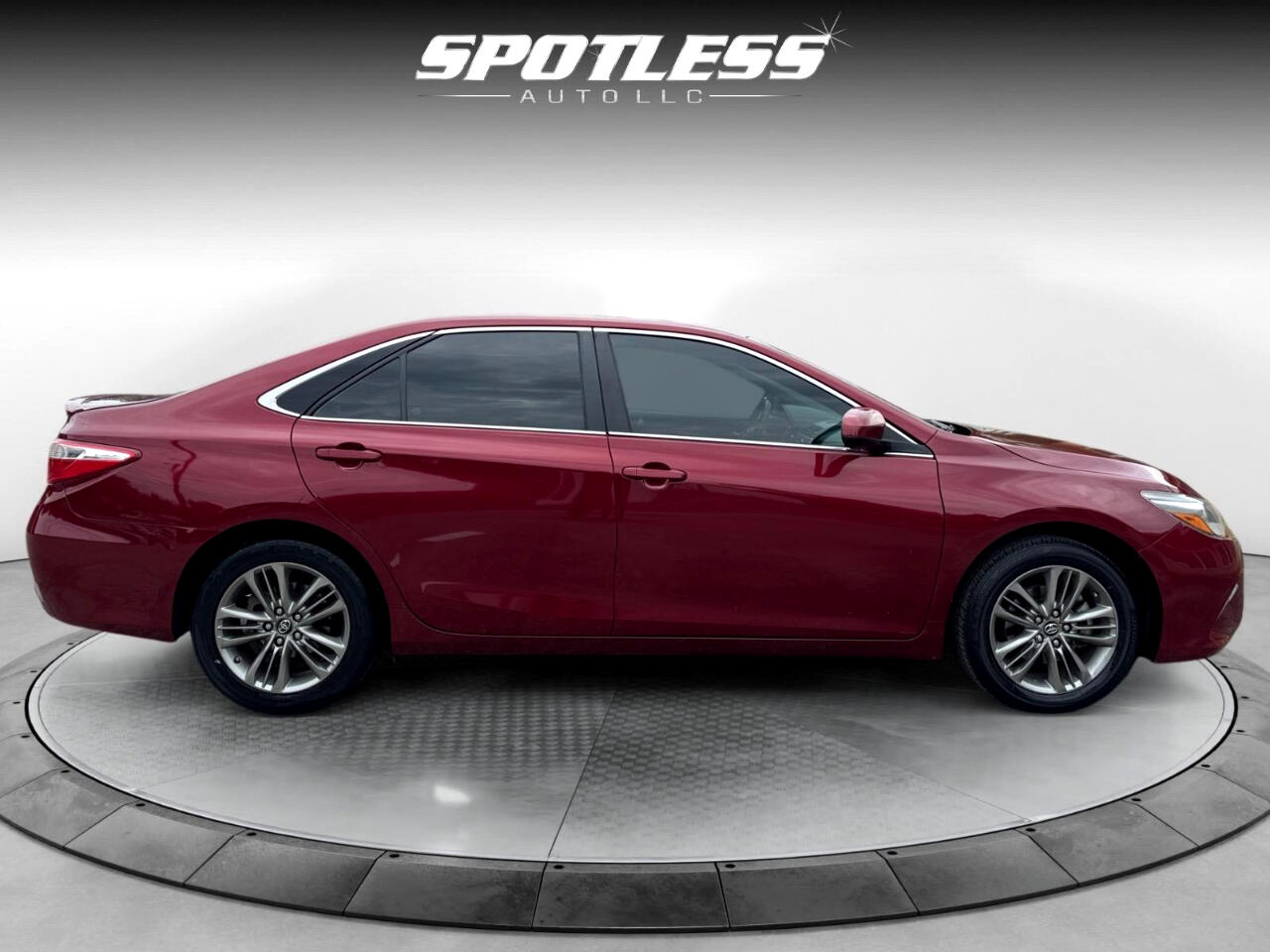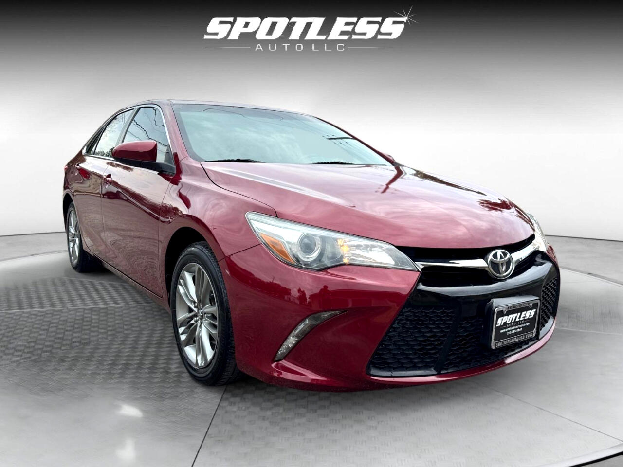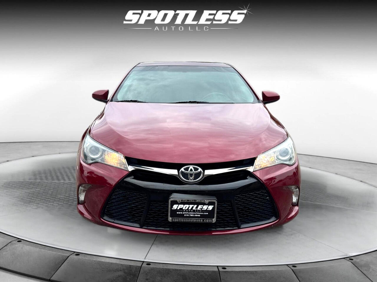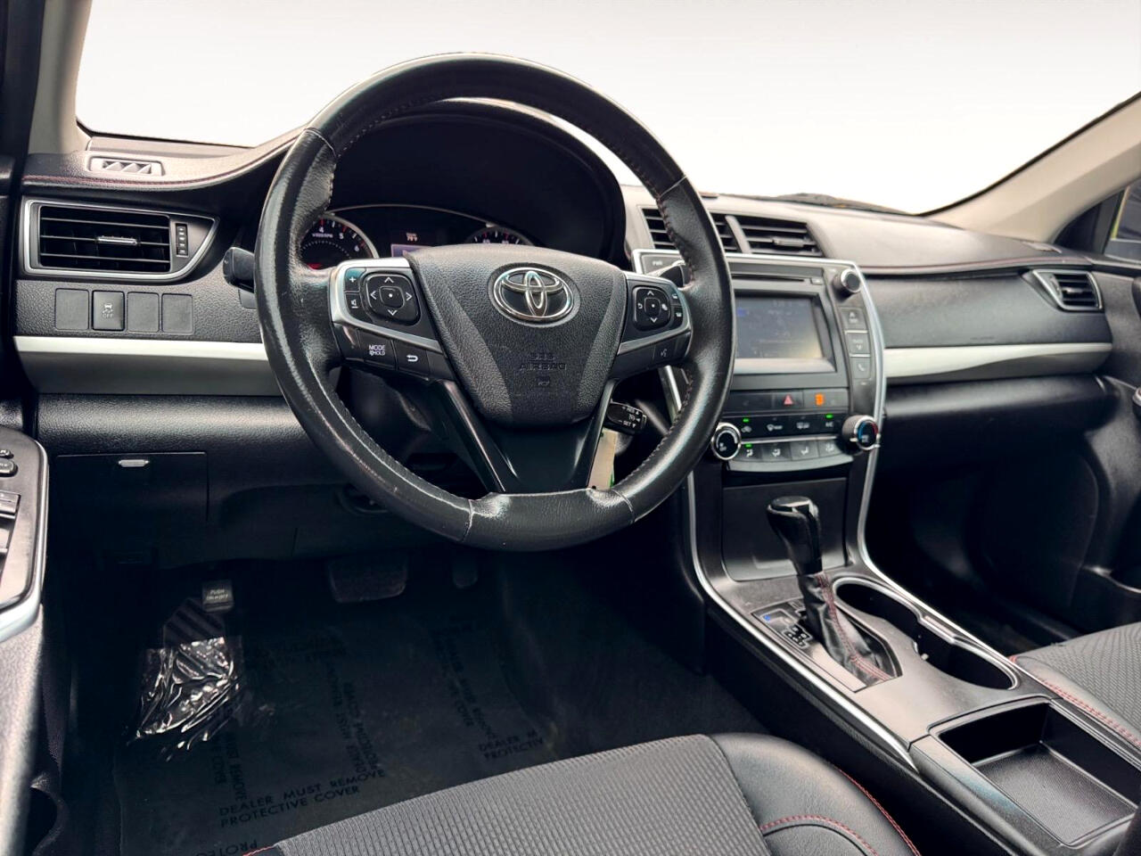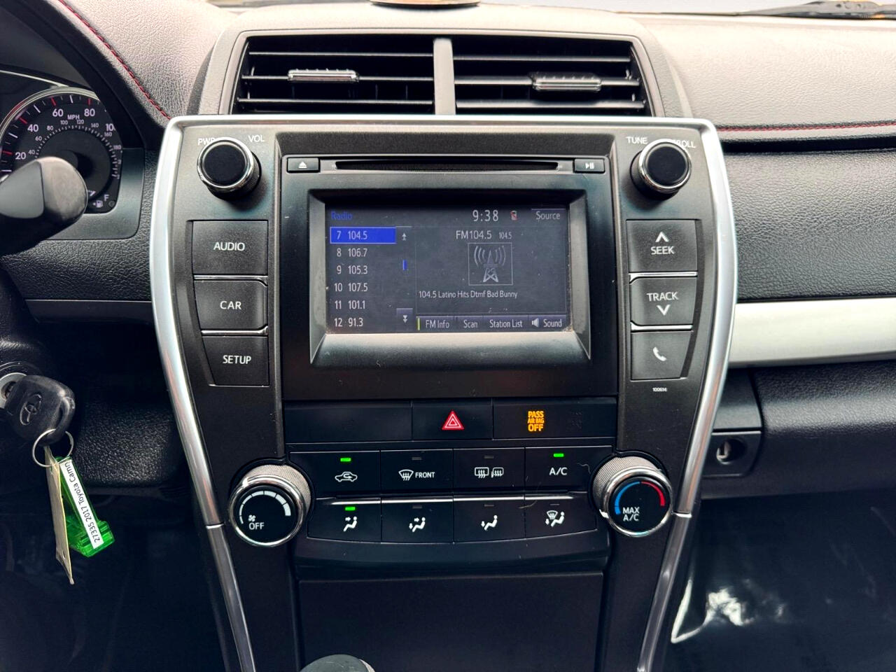 24/33 City/Highway MPG Red 2017 Toyota Camry XSE FWD 6-Speed Automatic 2.5L I4 SMPI DOHC Leather. Awards: * 2017 KBB.com 10 Most Comfortable Cars Under $30,000 * 2017 KBB.com 10 Best Sedans Under $25,000 * 2017 KBB.com 10 Best Used Cars Under $20,000 * 2017 KBB.com 10 Most Awarded Brands * 2017 KBB.com Best Resale Value Awards Leather, 10 Speakers, 4-Wheel Disc Brakes, 7.5J x 18" Alloy Wheels, ABS brakes, Air Conditioning, Alloy wheels, AM/FM radio: SiriusXM, Automatic temperature control, Brake assist, Bumpers: body-color, CD player, Delay-off headlights, Driver door bin, Driver vanity mirror, Dual front impact airbags, Dual front side impact airbags, Electronic Stability Control, Exterior Parking Camera Rear, Four wheel independent suspension, Front anti-roll bar, Front Bucket Seats, Front Center Armrest, Front dual zone A/C, Front reading lights, Fully automatic headlights, Heated door mirrors, Heated front seats, Illuminated entry, Knee airbag, Leather steering wheel, Low tire pressure warning, Multi-Stage Heated Front Bucket Seats, Occupant sensing airbag, Outside temperature display, Overhead airbag, Overhead console, Panic alarm, Passenger door bin, Passenger vanity mirror, Power door mirrors, Power driver seat, Power passenger seat, Power steering, Power windows, Radio: Entune Audio Plus w/Connected Nav/JBL Audio, Rear anti-roll bar, Rear seat center armrest, Rear side impact airbag, Rear window defroster, Remote keyless entry, Speed control, Speed-sensing steering, Split folding rear seat, Spoiler, Sport Leather-Trimmed Ultrasuede Seat Trim, Sport steering wheel, Steering wheel mounted audio controls, Tachometer, Telescoping steering wheel, Tilt steering wheel, Traction control, Trip computer, and Variably intermittent wipers.