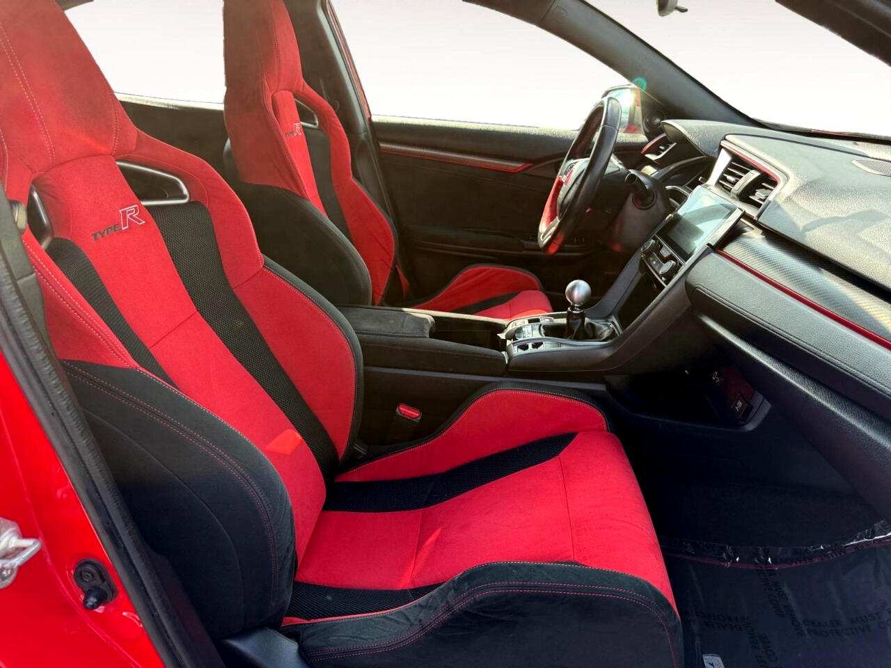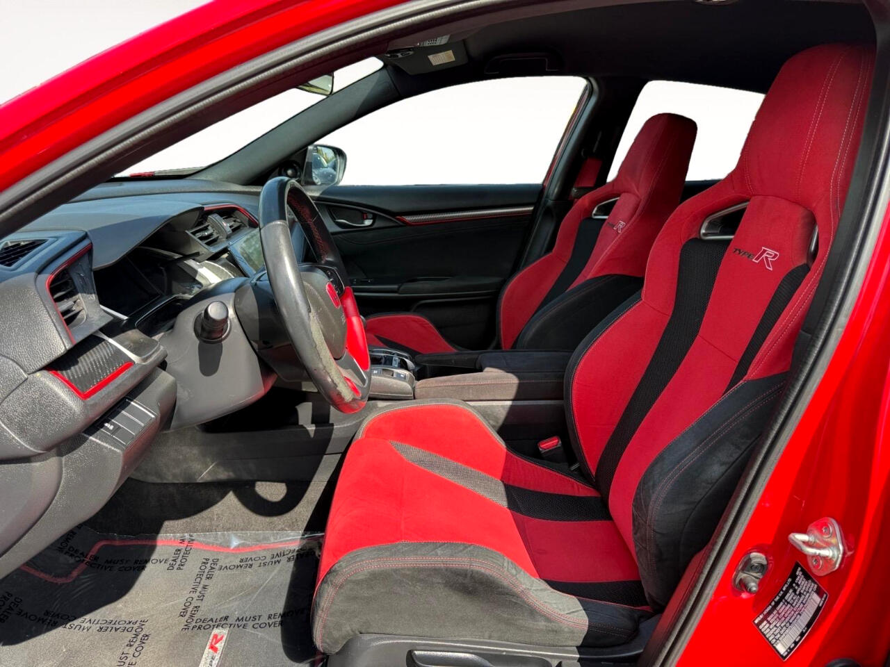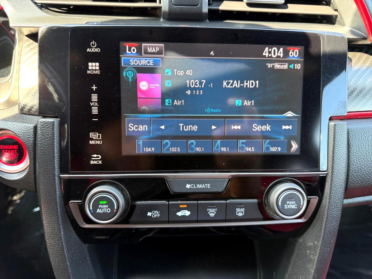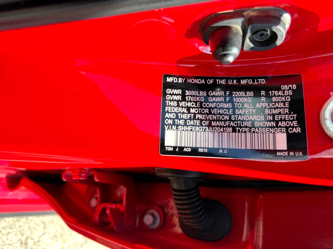 22/28 City/Highway MPG Red 2018 Honda Civic Type R Touring FWD 6-Speed Manual 2.0L I4 DOHC 16V Awards: * 2018 KBB.com Brand Image Awards * 2018 KBB.com 10 Most Awarded Brands Kelley Blue Book Brand Image Awards are based on the Brand Watch(tm) study from Kelley Blue Book Market Intelligence. Award calculated among non-luxury shoppers. For more information, visit www.kbb.com. Kelley Blue Book is a registered trademark of Kelley Blue Book Co., Inc. 12 Speakers, 4-Wheel Disc Brakes, ABS brakes, Air Conditioning, Alloy wheels, AM/FM radio: SiriusXM, Apple CarPlay/Android Auto, Automatic temperature control, Brake assist, Bumpers: body-color, Compass, Delay-off headlights, Driver door bin, Driver vanity mirror, Dual front impact airbags, Dual front side impact airbags, Electronic Stability Control, Emergency communication system: HondaLink, Exterior Parking Camera Rear, Four wheel independent suspension, Front anti-roll bar, Front Bucket Seats, Front Center Armrest, Front dual zone A/C, Front fog lights, Front reading lights, Fully automatic headlights, Heated door mirrors, High-Bolstered Front Bucket Sport Seats, Illuminated entry, Low tire pressure warning, Navigation System, Occupant sensing airbag, Outside temperature display, Overhead airbag, Panic alarm, Passenger door bin, Passenger vanity mirror, Power door mirrors, Power steering, Power windows, Radio data system, Radio: 540-Watt AM/FM/HD/SiriusXM Premium Audio, Rear anti-roll bar, Rear window defroster, Rear window wiper, Remote keyless entry, Security system, Speed control, Speed-sensing steering, Speed-Sensitive Wipers, Split folding rear seat, Spoiler, Steering wheel mounted audio controls, Suede-Effect Fabric Seating Surfaces w/Type R Logo, Tachometer, Telescoping steering wheel, Tilt steering wheel, Traction control, Trip computer, Turn signal indicator mirrors, Variably intermittent wipers, and Wheels: 20" x 8.5" Alloy.