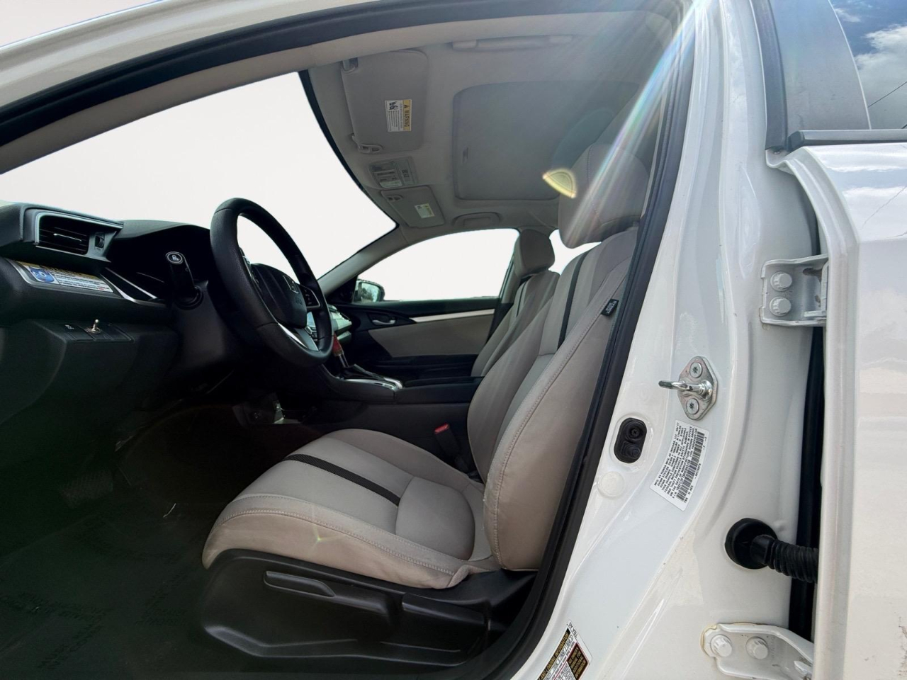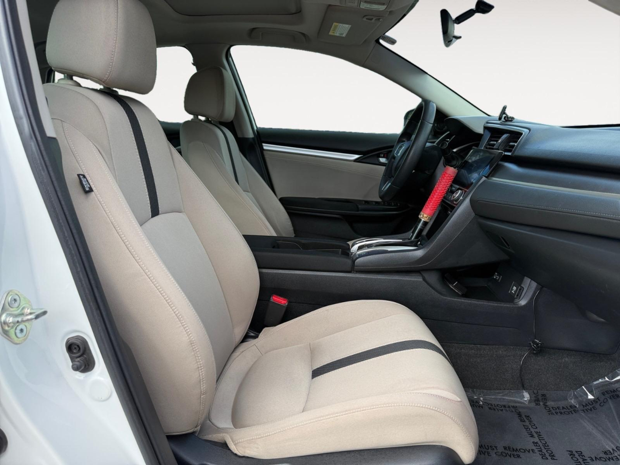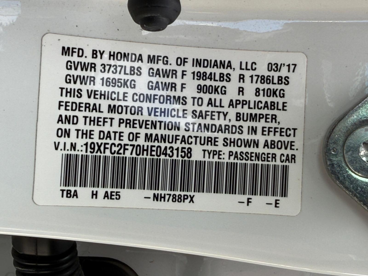 31/40 City/Highway MPG White 2017 Honda Civic EX FWD CVT 2.0L I4 DOHC 16V i-VTEC Cloth. Awards: * 2017 IIHS Top Safety Pick (When equipped with Honda Sensing) * 2017 KBB.com Brand Image Awards * 2017 KBB.com 10 Most Awarded Brands Kelley Blue Book Brand Image Awards are based on the Brand Watch(tm) study from Kelley Blue Book Market Intelligence. Award calculated among non-luxury shoppers. For more information, visit www.kbb.com. Kelley Blue Book is a registered trademark of Kelley Blue Book Co., Inc. Cloth, 16" Alloy Wheels, 4-Wheel Disc Brakes, 8 Speakers, ABS brakes, Air Conditioning, Alloy wheels, AM/FM radio, Apple CarPlay/Android Auto, Automatic temperature control, Brake assist, Bumpers: body-color, Cloth Seat Trim, Compass, Delay-off headlights, Driver door bin, Driver vanity mirror, Dual front impact airbags, Dual front side impact airbags, Electronic Stability Control, Emergency communication system, Exterior Parking Camera Rear, Four wheel independent suspension, Front anti-roll bar, Front Bucket Seats, Front Center Armrest, Front reading lights, Fully automatic headlights, Heated door mirrors, Illuminated entry, Low tire pressure warning, Occupant sensing airbag, Outside temperature display, Overhead airbag, Panic alarm, Passenger door bin, Passenger vanity mirror, Power door mirrors, Power moonroof, Power steering, Power windows, Radio data system, Radio: 180-Watt AM/FM/HD/SiriusXM Audio System, Rear anti-roll bar, Rear seat center armrest, Rear window defroster, Reclining Front Bucket Seats, Remote keyless entry, Security system, Speed control, Speed-sensing steering, Speed-Sensitive Wipers, Split folding rear seat, Steering wheel mounted audio controls, Tachometer, Telescoping steering wheel, Tilt steering wheel, Traction control, Trip computer, and Variably intermittent wipers.