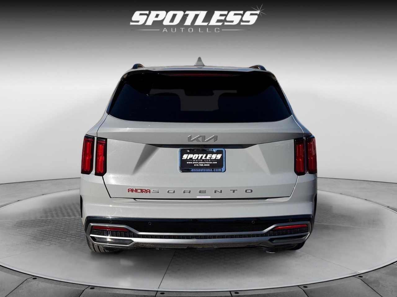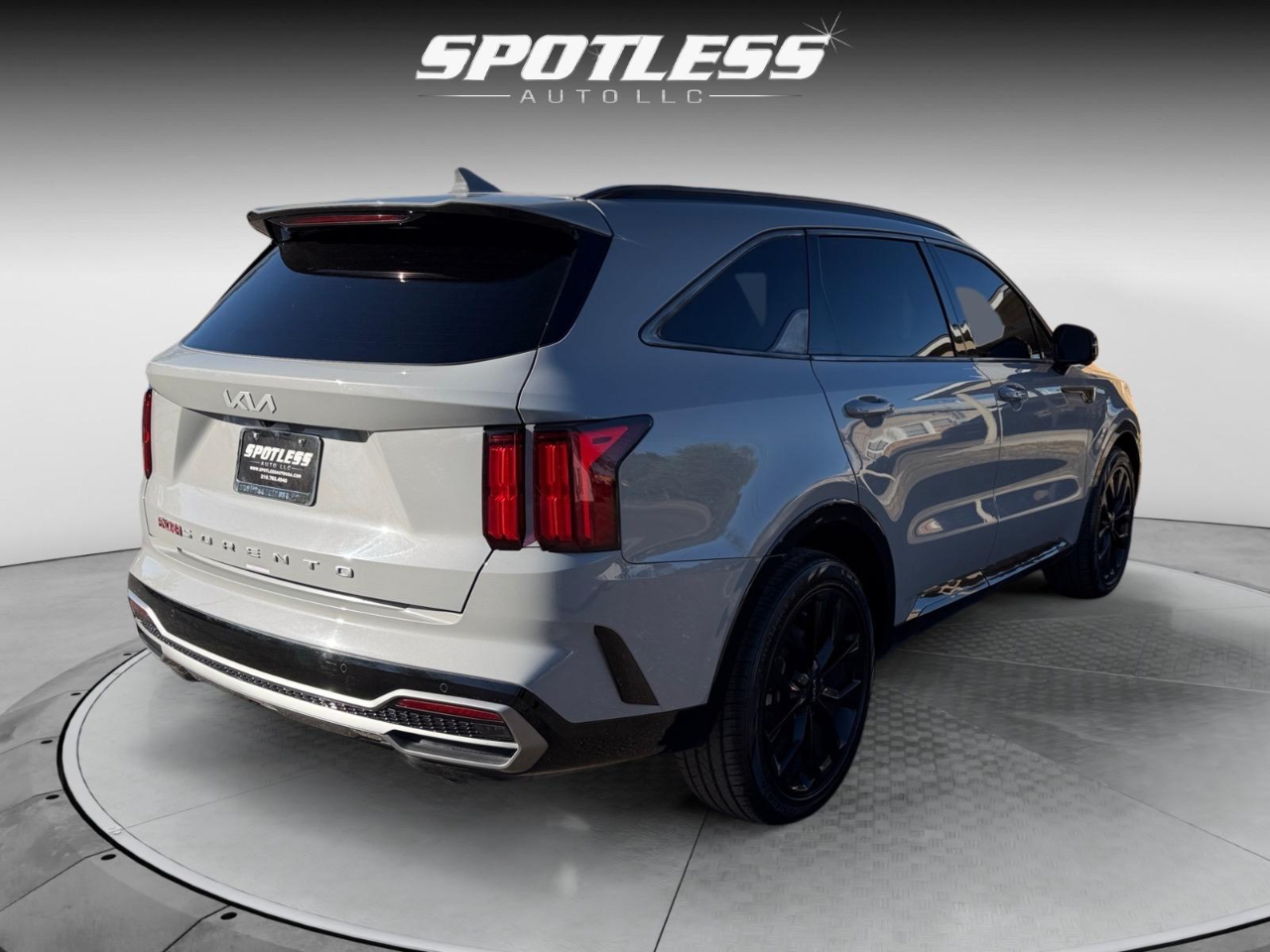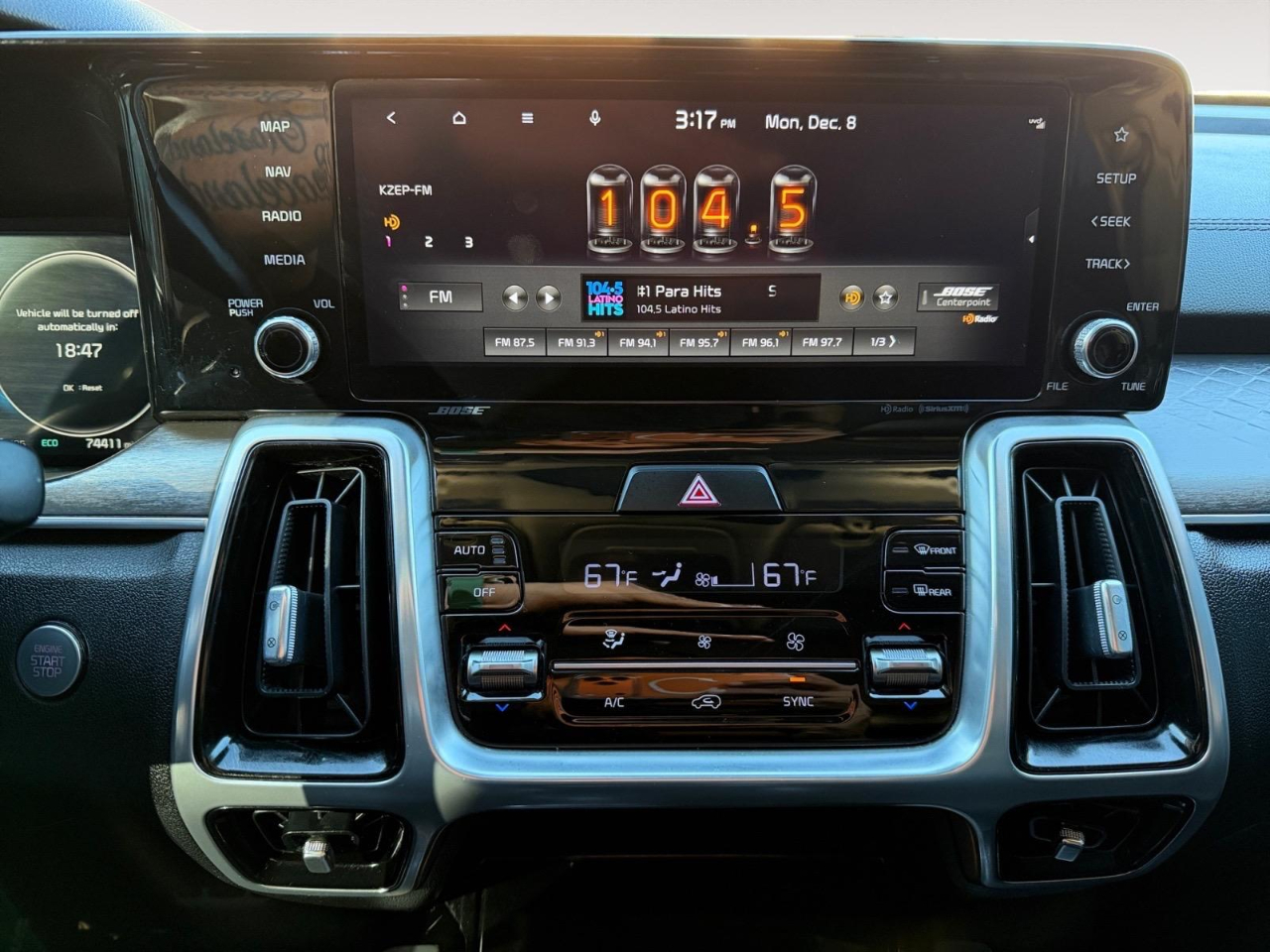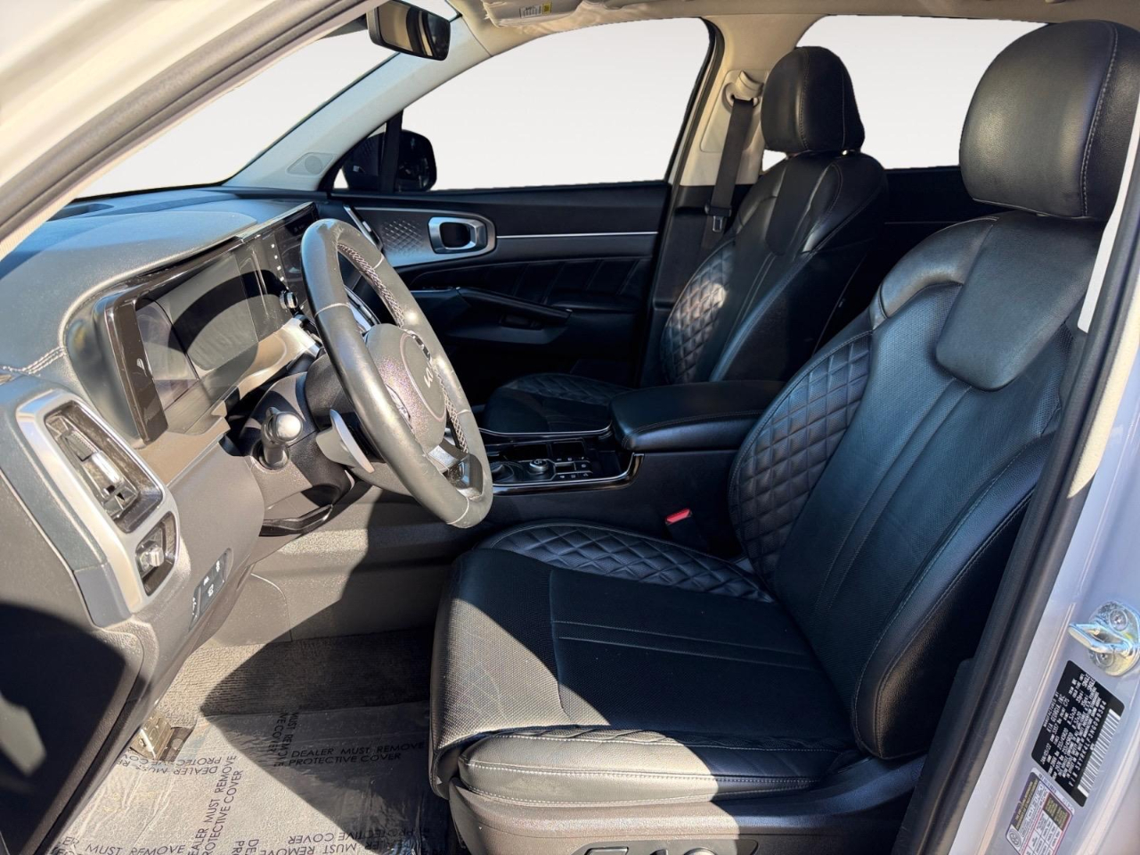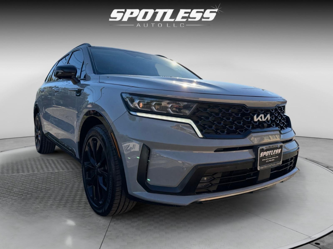 22/29 City/Highway MPG Wolf Gray 2022 Kia Sorento SX-Prestige FWD 8-Speed DCT 2.5L I4 DGI Turbocharged DOHC 16V LEV3-ULEV70 281hp 12 Speakers, 3.316 Axle Ratio, 3rd row seats: split-bench, 4-Wheel Disc Brakes, ABS brakes, Air Conditioning, Alloy wheels, AM/FM radio: SiriusXM, Apple CarPlay & Android Auto, Auto High-beam Headlights, Auto-dimming Rear-View mirror, Automatic temperature control, Brake assist, Bumpers: body-color, Carpeted Floor Mats, Delay-off headlights, Driver door bin, Driver vanity mirror, Dual front impact airbags, Dual front side impact airbags, Electronic Stability Control, Emergency communication system: UVO Link, Four wheel independent suspension, Front anti-roll bar, Front Bucket Seats, Front Center Armrest, Front dual zone A/C, Front fog lights, Front reading lights, Fully automatic headlights, Heated & Ventilated Front Bucket Seats, Heated door mirrors, Heated front seats, Heated rear seats, Heated steering wheel, Illuminated entry, Knee airbag, Leather steering wheel, Low tire pressure warning, Memory seat, Navigation System, Occupant sensing airbag, Outside temperature display, Overhead airbag, Overhead console, Panic alarm, Passenger door bin, Passenger vanity mirror, Perforated Genuine Leather Seat Trim, Power door mirrors, Power driver seat, Power Liftgate, Power moonroof, Power passenger seat, Power steering, Power windows, Radio data system, Radio: AM/FM Bose Premium Audio System, Rear air conditioning, Rear anti-roll bar, Rear reading lights, Rear window defroster, Rear window wiper, Remote keyless entry, Roof rack: rails only, Security system, Smart Key w/ Push Button and Remote Start, Speed control, Speed-sensing steering, Split folding rear seat, Spoiler, Steering wheel mounted audio controls, Tachometer, Telescoping steering wheel, Tilt steering wheel, Traction control, Trip computer, Turn signal indicator mirrors, Variably intermittent wipers, Ventilated front seats, and Wheels: 8.5J x 20" Gloss Black Alloy.