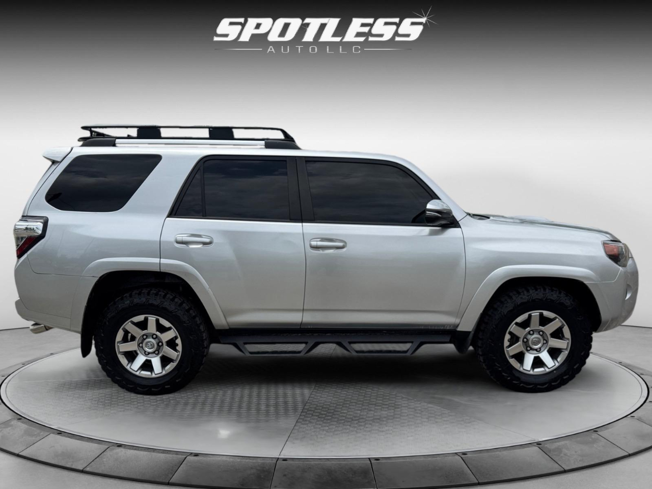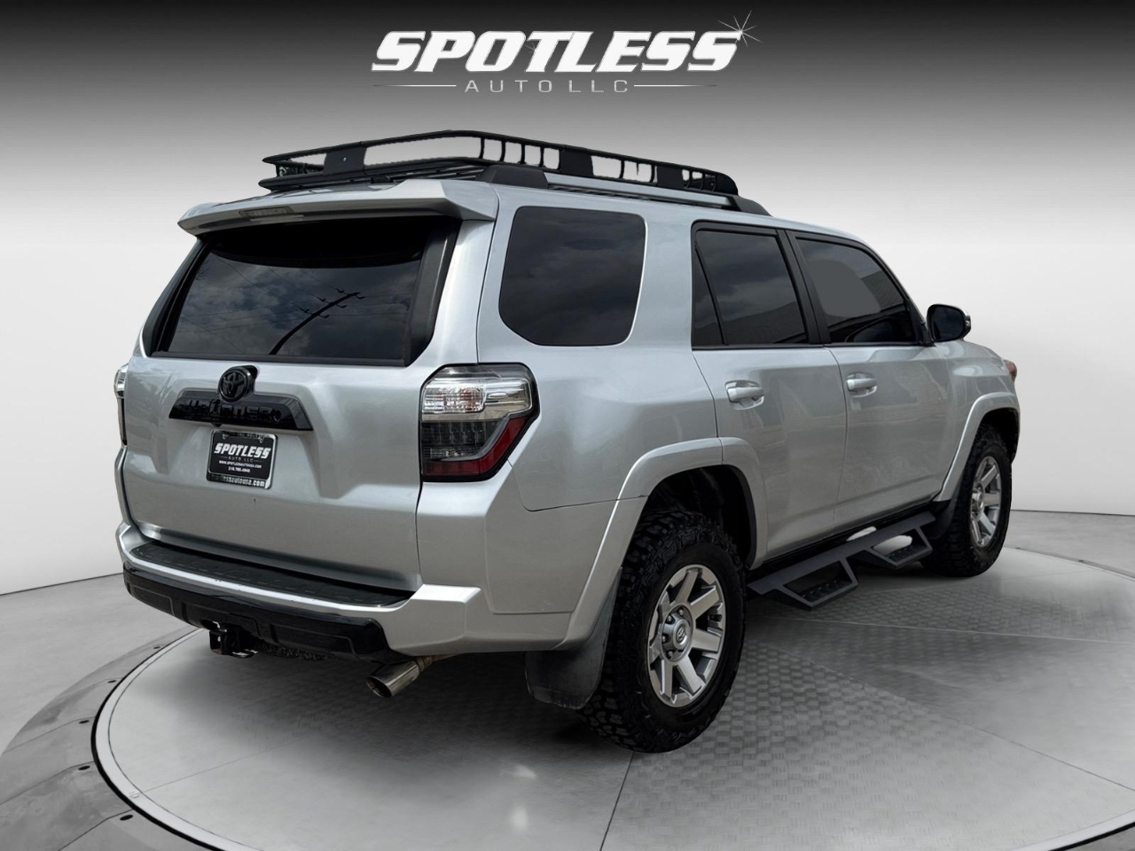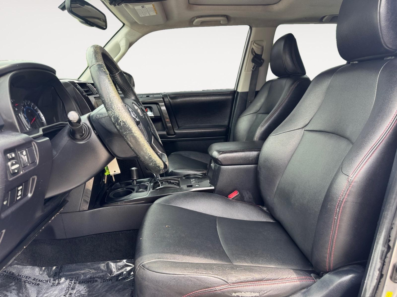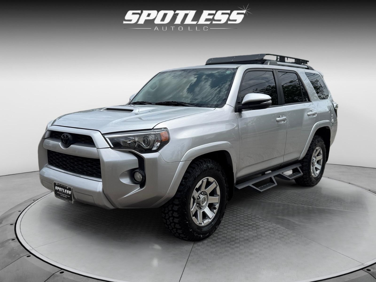 Silver 2016 Toyota 4Runner SR5 4WD 5-Speed Automatic with Overdrive 4.0L V6 SMPI DOHC 4WD, Cloth. Awards: * 2016 KBB.com Best Resale Value Awards 4WD, Cloth, 17" x 7.0" 6-Spoke Alloy Wheels, 3.727 Axle Ratio, 4-Wheel Disc Brakes, 8 Speakers, ABS brakes, Air Conditioning, Alloy wheels, AM/FM radio: SiriusXM, Anti-whiplash front head restraints, Brake assist, Bumpers: body-color, CD player, Driver door bin, Driver vanity mirror, Dual front impact airbags, Dual front side impact airbags, Electronic Stability Control, Exterior Parking Camera Rear, Front anti-roll bar, Front Bucket Seats, Front Center Armrest, Front fog lights, Front reading lights, Front wheel independent suspension, Heated door mirrors, Illuminated entry, Knee airbag, Leather Shift Knob, Leather steering wheel, Low Fabric Seat Trim, Low tire pressure warning, Occupant sensing airbag, Outside temperature display, Overhead airbag, Overhead console, Panic alarm, Passenger door bin, Passenger vanity mirror, Power door mirrors, Power driver seat, Power steering, Power windows, Radio: Entune Audio Plus w/Connected Navigation, Rear anti-roll bar, Rear seat center armrest, Rear window defroster, Rear window wiper, Remote keyless entry, Roof rack: rails only, Speed control, Speed-sensing steering, Split folding rear seat, Spoiler, Steering wheel mounted audio controls, Tachometer, Telescoping steering wheel, Tilt steering wheel, Traction control, Trip computer, Variably intermittent wipers, and Voltmeter.